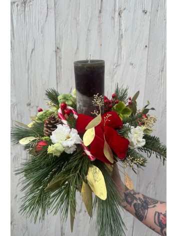 Arrangement de bougies avec conifères et éléments de Noël dans la plus pure tradition
