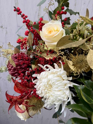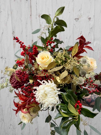 Bouquet de fleurs de saison en rouge et blanc qui rappelle les célébres cannes à sucres