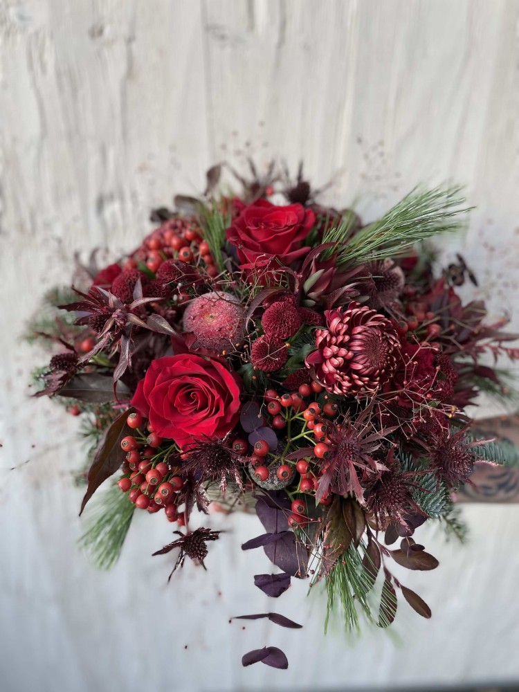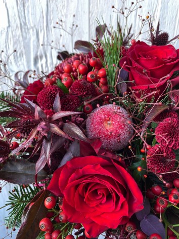 Compositions de fleurs fraîches toutes de rouge vêtues piquées dans un corbeille avec une touche d'éléments de Noël pour le côté festif